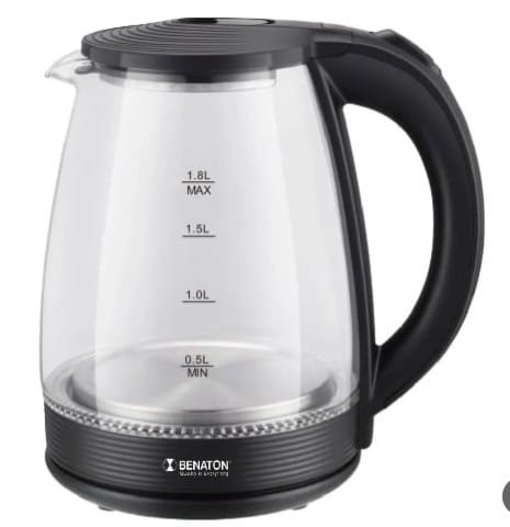 קומקום חשמלי איכותי מבית Benaton, בעיצוב אלגנטי מזכוכית שקופה עם בסיס מסתובב 360°.